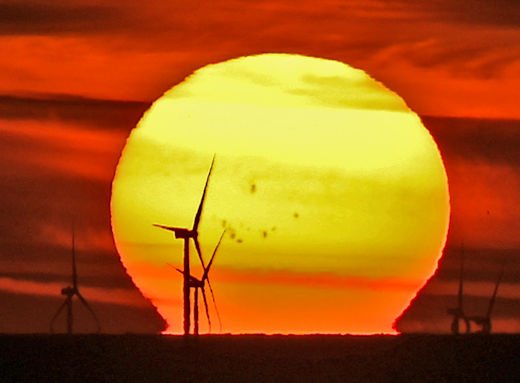 «Καθώς πλησιάζει το ηλιακό μέγιστο, ο ηλιακός δίσκος είναι διάστικτος με εκπληκτικές ηλιακές κηλίδες», λέει ο Κούμαν. «Δεν χρειαζόμουν φίλτρα για να τα φωτογραφίσω μαζί με τους ανεμόμυλους στη Βόρεια Θάλασσα».