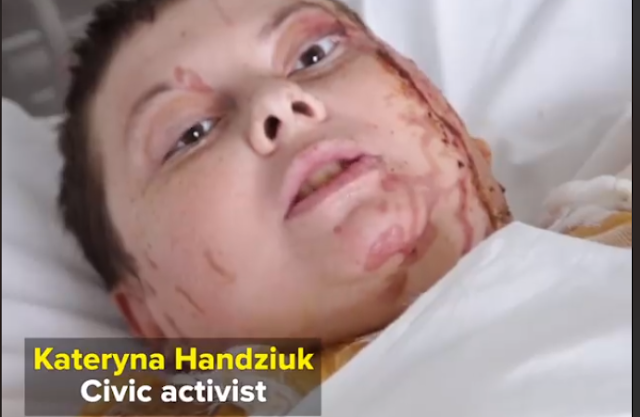 Οι έρευνες της Kateryna Handzyuk σχετικά με τη διαφθορά στην αστυνομία και την πολιτική στην γεννέτειρά της το Kherson, λιμάνι της Μαύρης Θάλασσας, είχαν εξοργίσει τους τοπικούς αξιωματούχους. Στα τέλη Ιουλίου, ένας άντρας την περιέλουσε με ένα λίτρο θεικό οξύ όταν έφευγε από το σπίτι της.