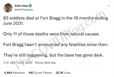 Δεν έδωσε περισσότερες λεπτομέρειες. Αλλά αν οι αριθμοί του είναι αληθινοί, τότε 39 στρατιώτες πέθαναν στο Φορτ Μπραγκ τους πρώτους έξι μήνες του 2021. Η ιστορία έγινε τόσο άσχημη που ο Φορτ Μπραγκ σταμάτησε να δημοσιοποιεί λεπτομέρειες για τους θανάτους στρατιωτών το περασμένο καλοκαίρι, σύμφωνα με τον κ. Χαρπ. Αλλά πολλά έγγραφα έχουν διαρρεύσει από τότε, που δείχνουν ότι η σφαγή δεν έχει επιβραδυνθεί καθόλου. Σημειώστε ότι η εντολή για στρατιωτικό εμβόλιο Μπάιντεν ανακοινώθηκε στις αρχές Αυγούστου και τέθηκε σε ισχύ στις 24 Αυγούστου 2021. Οι θάνατοι επιταχύνθηκαν από τότε.