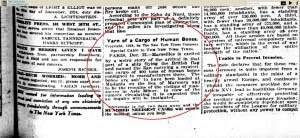 «Ανθρώπινο» φορτίο. Το θέμα φαίνεται ότι έγινε γνωστό και προκάλεσε έκπληξη σε κάποιους κύκλους. Η εφημερίδα «New York Times» τον Δεκέμβριο του 1924 και με τίτλο «Μια απίθανη ιστορία από ένα φορτίο με ανθρώπινα οστά» παρουσιάζει την είδηση: «Η Μασσαλία είναι σε αναταραχή από μια ασύλληπτη ιστορία (που οφείλεται) στην άφιξη στο λιμάνι ενός πλοίου που φέρει βρετανική σημαία και ονομάζεται “Ζαν” και μεταφέρει ένα μυστήριο φορτίο 400 τόνων ανθρώπινων οστών για να χρησιμοποιηθούν στις εκεί βιοτεχνίες. Λέγεται ότι τα οστά φορτώθηκαν στα Μουδανιά, στη θάλασσα του Μαρμαρά και είναι τα απομεινάρια θυμάτων από τις σφαγές στη Μικρά Ασία. Εν όψει της φήμης που κυκλοφορεί αναμένεται να διαταχθεί έρευνα». Ιστορική απόδειξη.