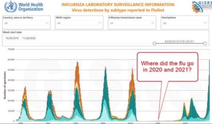 Όπως βλέπετε, η εποχική γρίπη και τα άχρηστα ναρκωτικά είναι ασυμβίβαστα. Μόλις ο COVID-19 χτυπήσει τον κόσμο, μόλις οι ενοχλητικοί διανομείς σέρνονται σαν κατσαρίδες από κάθε γωνιά και σχισμή προσφέροντας θεραπεία, η γρίπη εξαφανίζεται, εξαφανίζεται στο τίποτα. Φέτος, υπάρχει ακόμα γρίπη. Επομένως, δεν υπάρχει COVID-19.