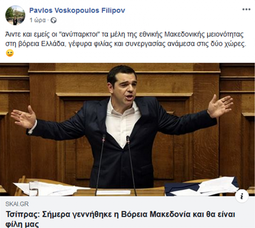 Με ανάρτησή του στην προσωπική σελίδα του στο facebook ο επικεφαλής του σλαβόφωνου κόμματος “Ουράνιο Τόξο” με έδρα την Φλώρινα Παύλος Βοσκόπουλος, περιχαρής για την υπερψήφιση της Συμφωνίας, αναφέρεται για δεύτερη φορά στη γέφυρα φιλίας που θα χτίσουν μεταξύ Ελλάδας και Βόρειας Μακεδονίας πλέον, τα “μέλη της εθνικής Μακεδονικής μειονότητας στη βόρεια Ελλάδα”.