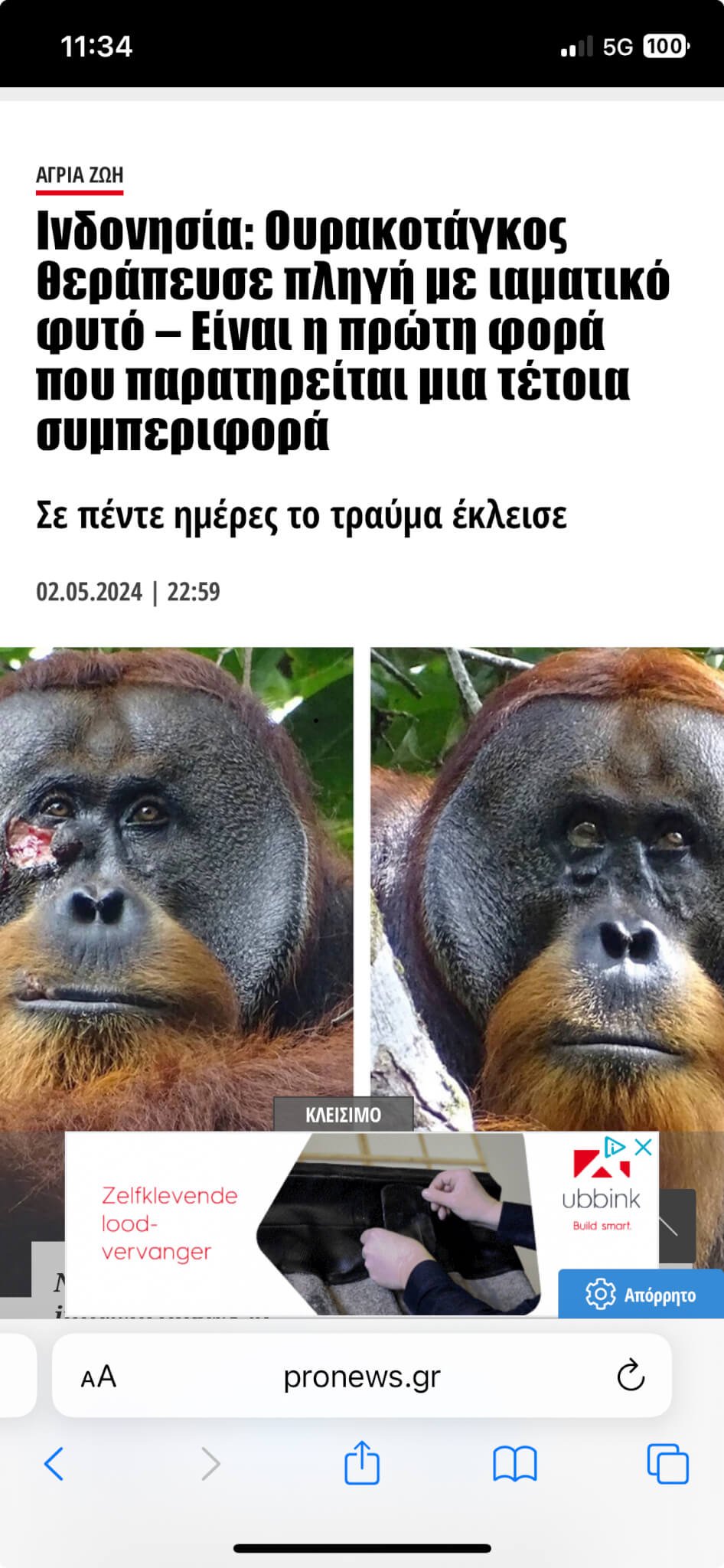 Είναι η πρώτη φορά που παρατηρείται μια συμπεριφορά ουρακοτάγκου που θεραπεύει τον εαυτό του. Έγινε και είδηση ενω ποτέ δεν θα γίνει είδηση η μαζική εξόντωση εκατομμυρίων εμβολιασμένων που πεθαίνουν μαζικά λόγω του εκφοβισμού και παραπλάνησης από αυτούς που τους εξουσιάζουν. Το μισος για το ανθρώπινο είδος είναι τεράστιο από αυτούς που έχουν το μονοπώλιο της υγείες και κάθε άλλης επιστήμης και επιτεύγματος.