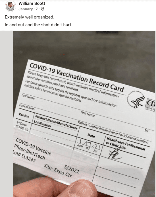 Ο Γουίλιαμ «Μπιλ» Σκοτ ανακοίνωσε στις 11 Ιανουαρίου ότι θα λάβει το πειραματικό εμβόλιο mRNA του Pfizer αργότερα εκείνη την εβδομάδα στο Κέντρο εκθέσεων των Συρακουσών. Δημοσίευσε την κάρτα ρεκόρ εμβολιασμού COVID-19 στις 17 Ιανουαρίου. Πολλά παράξενα σχόλια ακολουθούν την ανάρτηση. Ο κ. Scott έλαβε τη δεύτερη δόση στις 7 Φεβρουαρίου.