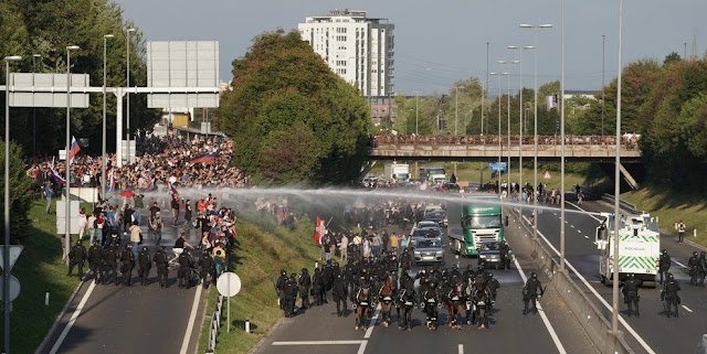 Μετά τις ομιλίες, το πλήθος κινήθηκε προς το Προεδρικό Μέγαρο και συνέχισε το δρόμο του στους δρόμους της Λιουμπλιάνα. Οι διαδηλωτές, οι οποίοι είναι κατά της υποχρεωτικής κάρτας COVID-19 προκειμένου να εργαστούν, να έχουν πρόσβαση σε βενζινάδικο ή σε εμπορικό κέντρο, έκλεισαν τελικά έναν αυτοκινητόδρομο. Η αστυνομία στάλθηκε στην περιοχή με κανόνια νερού για να πολεμήσει τους διαδηλωτές.