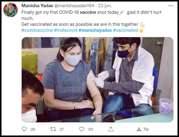 Η Manisha παρουσίασε τον πρώτο της εμβόλιο κατά του COVID στις 23 Ιουνίου.