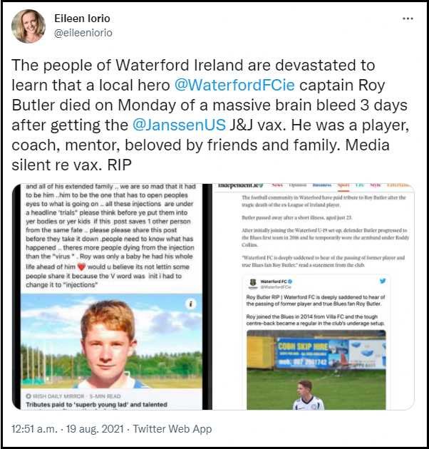 Ένας 23χρονος ποδοσφαιριστής πέθανε μετά από εγκεφαλικό που φαίνεται να είναι το αποτέλεσμα του εμβολίου COVID-19. Ο Roy Butler, πρώην παίκτης της Waterford FC, πέθανε σε νεαρή ηλικία 23 ετών. Ο θάνατός του έχει συγκλονίσει την ιρλανδική ποδοσφαιρική κοινότητα. Πηγές κοντά στην οικογένεια του Roy ισχυρίζονται ότι έλαβε το εμβόλιο Janssen COVID-19 την Παρασκευή 13 Αυγούστου. Ο Roy πέθανε μόλις τέσσερις ημέρες αργότερα, την Τρίτη 17 Αυγούστου. Δεν είχε γνωστά προβλήματα υγείας πριν από τον ξαφνικό θάνατό του.