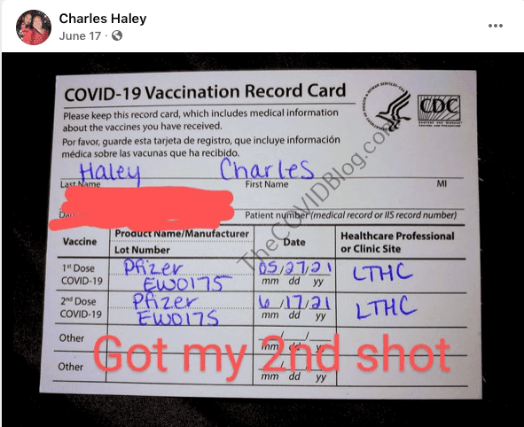 Ο κ. Charles Leo Haley II έλαβε την πρώτη του δόση πειραματικού mRNA Pfizer στις 27 Μαΐου στο Lummi Tribal Health Center στο Bellingham, σύμφωνα με τη σελίδα του στο Facebook.