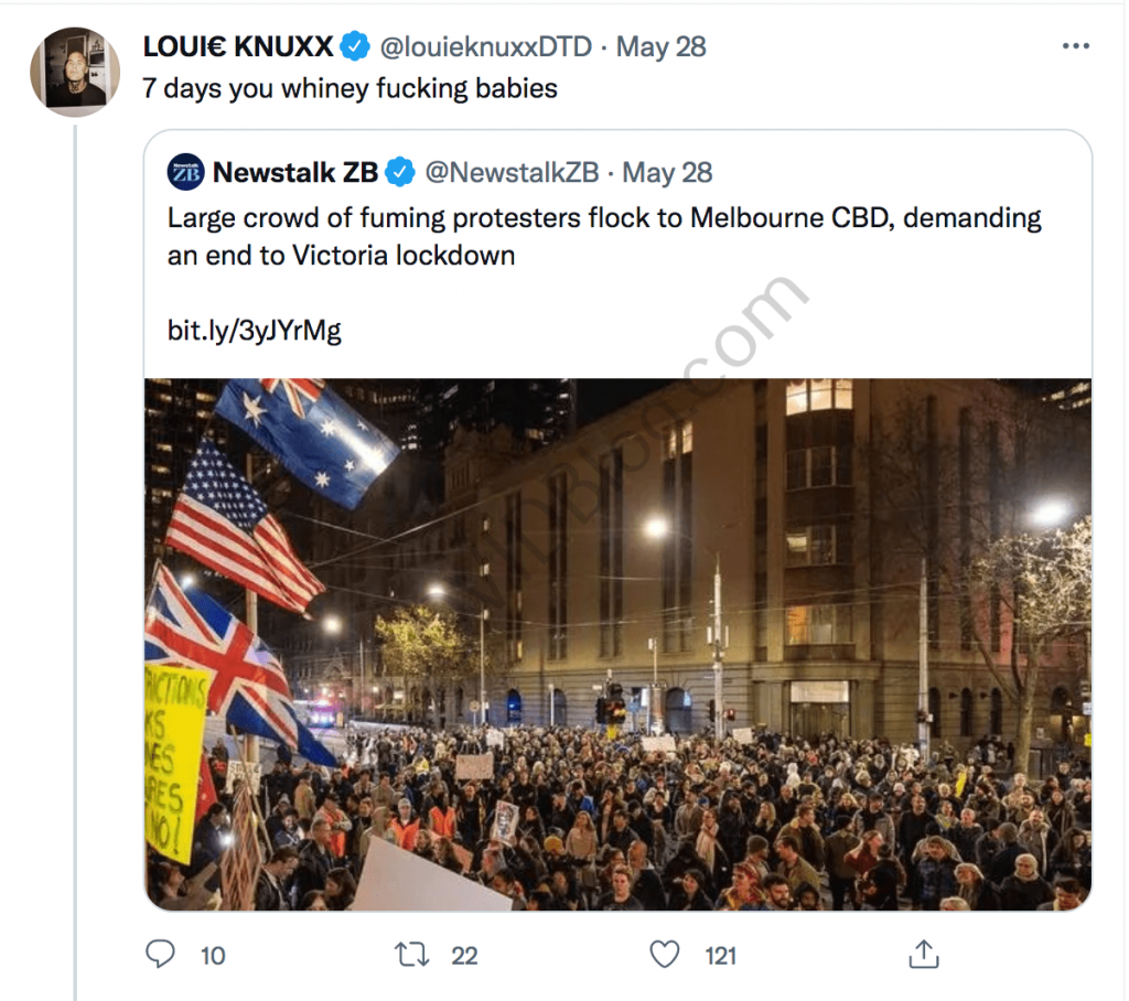 Χλεύαζε και έβριζε τους διαδηλωτές κατά της καραντίνας στην Αυστραλία που συνεχίζεται τουλάχιστον από τον Μάιο. Αναφέρθηκε στους χιλιάδες διαδηλωτές στη Μελβούρνη ως «γκρινιάρικα γαμημένα μωρά».