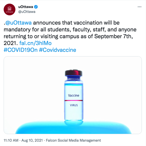 Το Πανεπιστήμιο της Οτάβα εξέδωσε «εντολή δημόσιας υγείας» στις 10 Αυγούστου. Όλοι οι φοιτητές, οι καθηγητές, το προσωπικό και οι επισκέπτες καλούνται να λάβουν mRNA ή ενέσεις DNA ιικού φορέα για να συμμετάσχουν σε δραστηριότητες στην πανεπιστημιούπολη. Η πρώτη ένεση απαιτείται έως τις 7 Σεπτεμβρίου. Η δεύτερη ένεση απαιτείται έως τις 15 Οκτωβρίου.