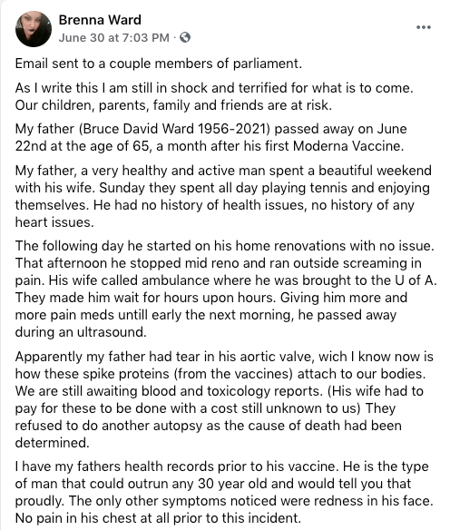 Ο Bruce David Ward έλαβε την πρώτη δόση πειραματικού mRNA Moderna στις 22 Μαΐου, σύμφωνα με την κόρη του, Brenna Ward. Δεν υπέστη άμεσες κάποιες δυσμενείς επιπτώσεις. Ο Ward απολάμβανε το Σαββατοκύριακο της Ημέρας του Πατέρα με τη γυναίκα του. Άρχισε να κάνει ανακαινίσεις στο σπίτι. Ξαφνικά, άρχισε να ουρλιάζει απο τους πόνους.