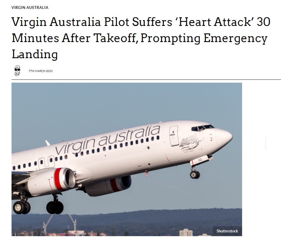 Ενας φίλος αναγνώστης μας άφησε σε σχόλιο την επόμενη περίπτωση θανάτου πιλότου στις 7/3/23 στην πτήση της Virgin Australia από την Αδελαΐδα στο Περθ και αναγκάστηκε να κάνει αναγκαστική προσγείωση αφού ο Πρώτος Αξιωματικός φέρεται να υπέστη καρδιακή προσβολή μόλις 30 λεπτά μετά την αναχώρηση!!!