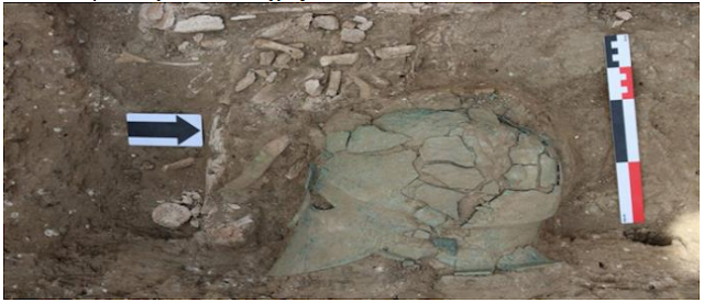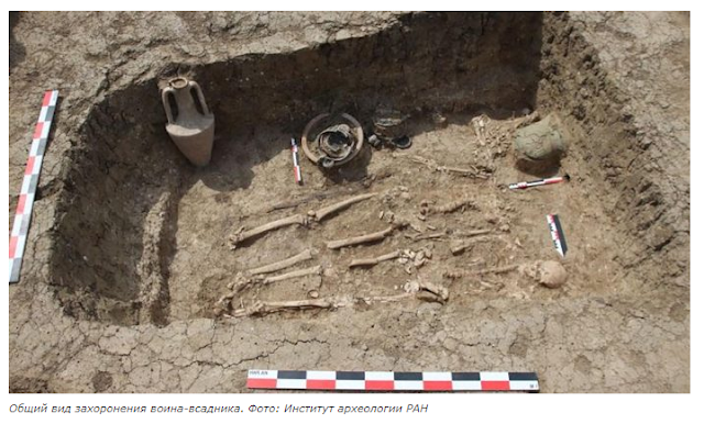 Η περικεφαλαία μαζί με άλλα αντικείμενα της ίδιας εποχής ήρθε στο φως από την ομάδα αρχαιολογικών εργασιών του Ινστιτούτου Αρχαιολογίας της Ρωσικής Ακαδημίας Επιστημών (IA RAS) που επιχειρεί, επί τριετία, στη νεκρόπολη έξω από το χωριό Volna όπου υπάρχουν περί τους 600 αρχαίους τάφους.