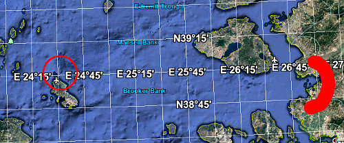 Όπως είδαμε από την ανάλυση γιά το Κοράλ, το υποβρύχιο πρέπει να βρισκόταν το πολύ μία μοίρα γεωγραφικού μήκους (κάπου 111 χιλιόμετρα) μακριά απ’ τη Σκύρο. Καί σαφώς πιό δυτικά απ’ τη μέση της διαδρομής. Γιατί; Γιά να βλέπει σε ευθεία τα Μιράζ τόσο πάνω απ’ το ανατολικό Αιγαίο (που πετούσαν ψηλά), όσο καί στη φάση προσεγγίσεως στο αεροδρόμιο Σκύρου γιά προσγείωση (που χαμήλωσαν).