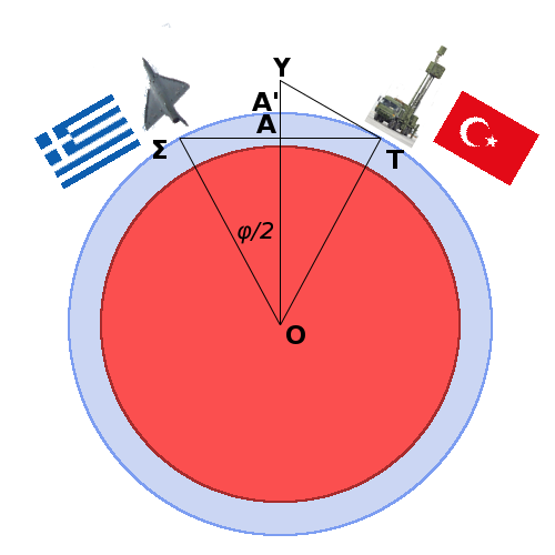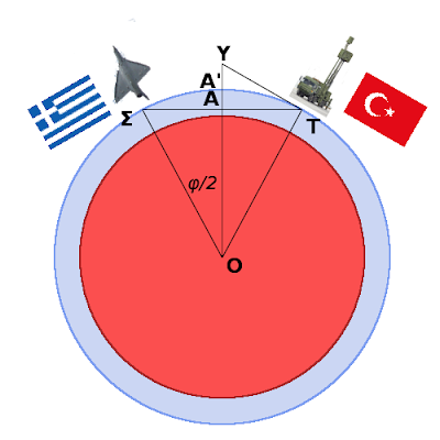 Ο είναι το κέντρο της Γής. Η γωνία ΣΟΤ (Σκύρος-κέντρο-Τουρκία) είναι δυόμιση μοίρες, άρα το μισό της 1.25 μοίρες (1 μοίρα καί 15′)· όμως, αυτά θα τα δούμε στο τέλος. Η γραμμή ΤΥ είναι εφαπτομένη στην επιφάνεια της Γής, καί είναι ακριβώς η τροχιά της ακτίνας του Κοράλ, αν αυτό σημαδέψει οριζόντια σε επίπεδο θάλασσας. Σημειώστε πως στο σχήμα δεν απεικονίζονται τα μεγέθη υπό κλίμακα, αλλά έτσι ώστε να διευκολυνθεί ο επιλύων.
