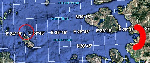 Βλέπουμε, λοιπόν, ότι το αεροδρόμιο Σκύρου βρίσκεται σε 24 μοίρες 30 πρώτα λεπτά ανατολικό γεωγραφικό μήκος. (Είναι πιό δυτικά απ’ τον περίφημο «εικοστό πέμπτο μεσημβρινό», άρα …μας το χαρίζουν οι τουρκαλάδες, διότι δεν το διεκδικούν! lol!!!) Καί η πιθανή περιοχή των Κοράλ στις 27 μοίρες ντάγκα. Πάμε τώρα να υπολογίσουμε την καμπυλότητα της Γής, γιά διαφορά δυόμιση μοιρών γεωγραφικού πλάτους.