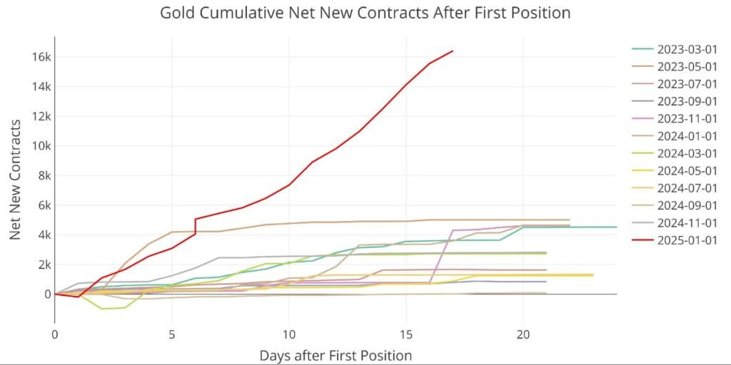Μια άλλη πολύ περίεργη πτυχή είναι ο τρόπος που έγινε η αγορά. Συνήθως, τα καθαρά νέα συμβόλαια εμφανίζονται στην αρχή του μήνα και στη συνέχεια η αγοραστική κατάσταση αρχίζει να μειώνεται. Κοιτάξτε όμως το παραπάνω γράφημα: απομένουν τρεις μέρες μέχρι το τέλος Ιανουαρίου και υπογράφονται ακόμη νέα συμβόλαια!