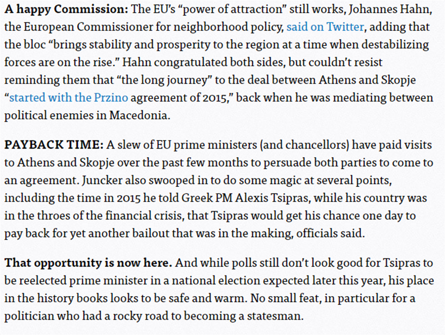 Το Politico κλείνει την αναφορά του στο θέμα της υπόσχεσης Τσίπρα και της πληρωμής του «γραμματίου» που οφείλει ο αρχηγός του ΣΥΡΙΖΑ στους Ευρωπαίους γράφοντας: «Ο Κυριάκος Μητσοτάκης, επικεφαλής της Νέας Δημοκρατίας, που πρεσβεύει τις ιδέες του EPP στην Ελλάδα, δεσμεύτηκε να ασκήσει βέτο στην προσχώρηση της Βόρειας Μακεδονίας στην Ευρωπαϊκή Ένωση εάν εκλεγεί πρωθυπουργός στις επόμενες εκλογές, εφόσον (γράφει το Politico) σημειώστε την διακριτική προϋπόθεση, «τα ελληνικά συμφέροντα δεν ικανοποιηθούν κατά τη διαδικασία ένταξης».
