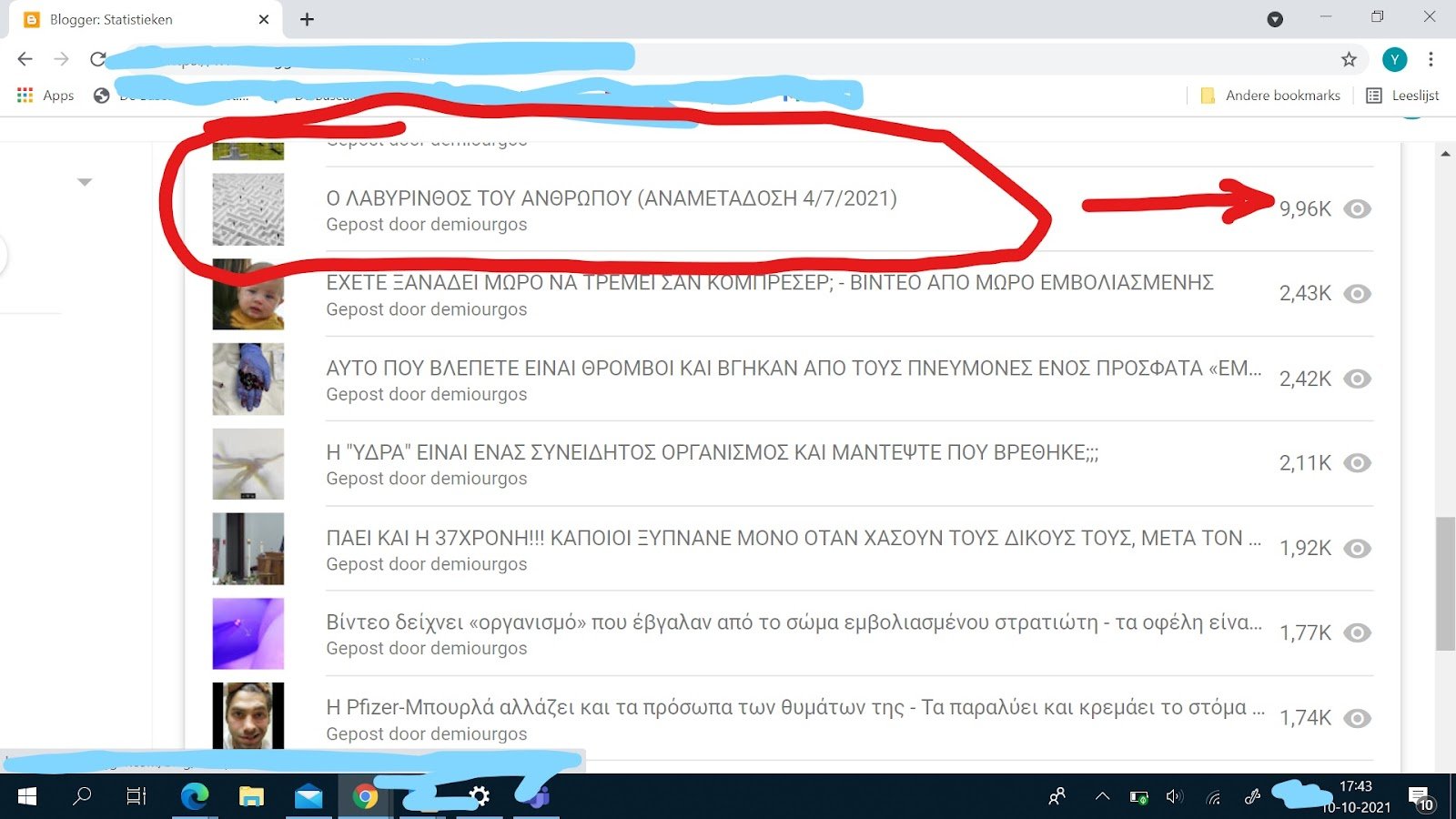 Στην εικόνα πάνω βλέπετε ότι έφτασε σήμερα κοντά στις 10.000 θεάσεις ενώ το βίντεο στο γιουτουμπ δείχνει 415 σήμερα 10-10-2021….