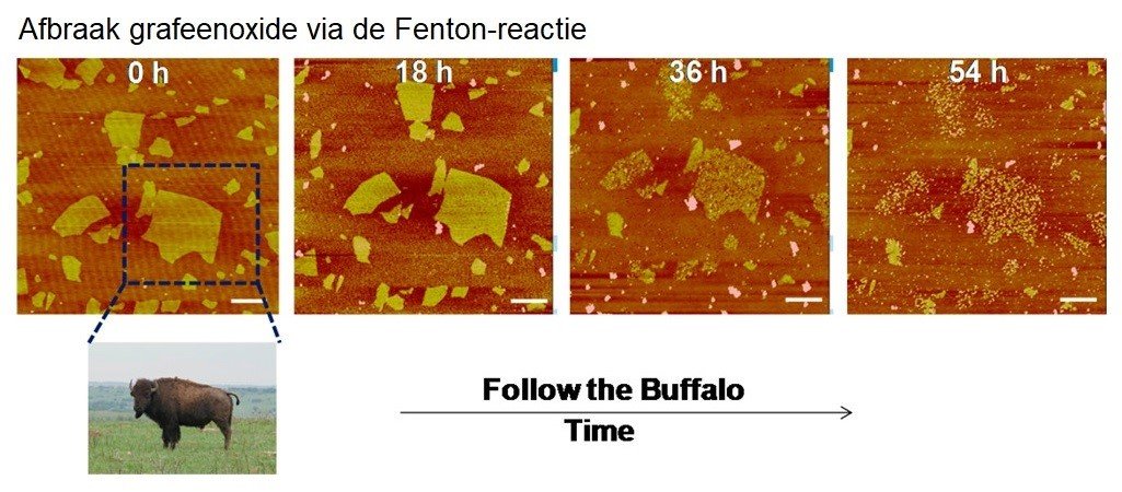 Επιστημονικές μελέτες δείχνουν ότι το οξείδιο του γραφενίου διασπάται χρησιμοποιώντας υπεροξείδιο του υδρογόνου. Δύο μηχανισμοί εμπλέκονται στη διαδικασία διάσπασης στο σώμα μας. Ένας μηχανισμός βασίζεται στο ένζυμο μυελοϋπεροξειδάση, το άλλο μέσω της αντίδρασης Fenton.