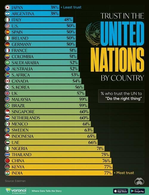 Μόλις το 38% των Ιάπωνων και Αργεντινών είχαν πίστη στον ΟΗΕ, μακράν τα χαμηλότερα επίπεδα εμπιστοσύνης. Μόνο μια άλλη χώρα ήταν κάτω από το όριο εμπιστοσύνης του 50%: η Ιταλία στο 48%.
