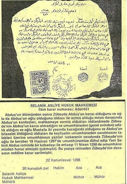 Η ακριβής μετάφραση της απόφασης 451 του δικαστηρίου έχει ως εξής: «Μετά τον θάνατο του Abduş η Zübeyde ισχυρίστηκε με μήνυση που κατέθεσε ότι ήταν η γυναίκα του Αbduş και το παιδί της ο Κεμάλ ο γιός του. Οι αδελφές του Abduş κατέθεσαν ότι η Zübeyde δεν ήταν παντρεμένη με τον αδελφό τους και ότι την πήρε σπίτι του ως ερωμένη από τον οίκο ανοχής. Στην αγκαλιά της τότε είχε τον δίχρονο γιό της Κεμάλ.