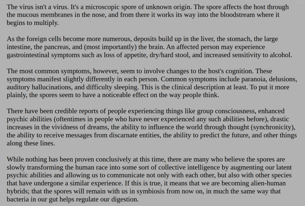 Αν όλα αυτά τελικά επιβεβαιωθούν και αποδειχθούν αληθινά, τότε αυτό σημαίνει ότι μεταλλασσόμαστε σε υβρίδια εξωγήινου-ανθρώπου. Ταυτόχρονα, τα ξένα σπόρια δεν γίνονται μέρος του DNA μας, αλλά βρίσκονται σε συμβίωση μαζί μας, όπως οι ηθοποιοί στα έντερα μας παρέχουν την πέψη και χωρίς αυτούς είναι αδύνατο.
