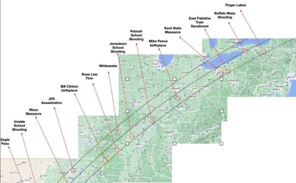 δ) Περίπου κατά μήκος της γραμμής της ηλιακής έκλειψης ήταν τα σύνορα μεταξύ των πρώιμων ΗΠΑ και των λεγόμενων «ινδικών εδαφών», γνωστή και ως Άγρια Δύση, όπου οι λευκοί δεν πήγαιναν χωρίς σκληρό δίσκο. Είναι πιθανό ότι οι Ινδοί σαμάνοι σημάδεψαν αυτή τη γραμμή με μερικές αρχαίες κατάρες (όπως η κατάρα του Tecumseh) έτσι ώστε οι άνθρωποι να περπατούν λιγότερο εκεί.