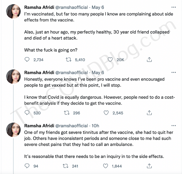 Η Ramsha Afridi είναι δημοσιογράφος με έδρα το Ηνωμένο Βασίλειο. Παραδέχεται ότι είναι «υπέρ του εμβολίου» και ενθαρρύνει άλλους να κάνουν τις ενέσεις γενετικής θεραπείας και ολέθρου. Πράγματι, έγραψε ένα άρθρο τον Δεκέμβριο 2021, περιγράφοντας πώς οι «αντι-εμβολιαστές» την έκαναν να χάσει την πίστη της στην πολιτική δεξιά. Αλλά σε ένα Twitter της 6ης Μαΐου, η Afridi ανέφερε ότι η 30χρονη φίλη της κατέρρευσε ξαφνικά και έπεσε νεκρή από καρδιακή προσβολή. Τρυπημένη βεβαίως με τα πολλά υποχρεωτικά οφέλη της χαζάρικης μαφίας.