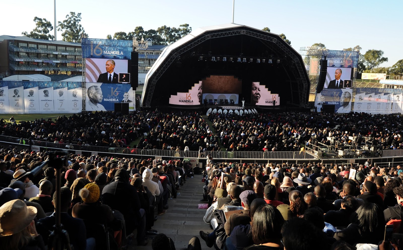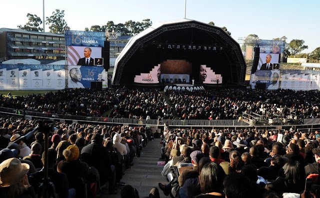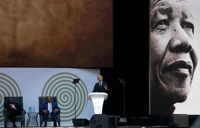 Ο Ομπάμα μίλησε μπροστά σε ένα κοινό περισσότερων 10.000 ανθρώπων σε ένα στάδιο κρίκετ στο Γιοχάνεσμπουργκ στην κύρια εκδήλωση των εορτασμών για τα 100 χρόνια από τη γέννηση του Νέλσον Μαντέλα.