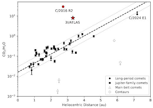 Ωστόσο, υπάρχει και κάτι παράξενο. Οι αναλογίες των διαφορετικών μορίων είναι αρκετά απροσδόκητες και δεν ταιριάζουν με αυτό που βλέπουμε στους κομήτες του Ηλιακού Συστήματος. Συγκεκριμένα, η αναλογία CO2/H20 8 ± 1 είναι εξαιρετικά υψηλή. Μόνο ένας άλλος κομήτης, ο C/2016 R2, είναι γνωστό ότι έχει παρόμοια χημεία, και οι αστρονόμοι τον θεωρούν εδώ και καιρό ένα «φρικιό».