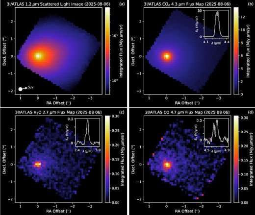 Το διαστημικό τηλεσκόπιο υπερύθρων βρήκε τα περισσότερα από τα συστατικά που περιμένουμε να βρούμε στους κομήτες. Υπάρχει ένα θολό κώμα, πτητικά παγάκια και όλα τα συνηθισμένα μόρια: νερό (H20), διοξείδιο του άνθρακα (CO2), μονοξείδιο του άνθρακα (CO). Αν το 3I/ATLAS είναι ένα διαστημόπλοιο, έχει μια παράξενη μεταμφίεση.