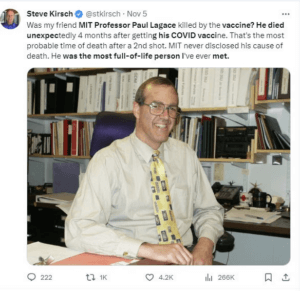 Είναι πολύ πιθανό ο φίλος μου, καθηγητής του MIT, Paul Lagace, να σκοτώθηκε επίσης από τον πυροβολισμό του COVID. Ο Paul και εγώ ήμασταν στην ίδια σουίτα στο MIT για 4 χρόνια. Ο Ο Paul πέθανε στη δική του πισίνα (πνίγηκε). Ο Paul εμβολιάστηκε με το εμβόλιο για τον COVID. Πέθανε περίπου 100 ημέρες μετά τον εμβολιασμό που είναι ο πιο πιθανός χρόνος για να πεθάνει μετά τη δεύτερη βολή.