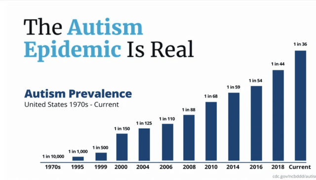Το ποσοστό του αυτισμού έχει κλιμακωθεί από 1 στους 10.000 τη δεκαετία του 1970 σε 1 στους 36 σήμερα, σύμφωνα με στοιχεία του 2024 από τον οργανισμό δημόσιας υγείας των ΗΠΑ, Κέντρα Ελέγχου και Πρόληψης Νοσημάτων (CDC). Το CDC μετονόμασε τον μήνα Απρίλιο από «Μήνας Ευαισθητοποίησης για τον Αυτισμό» σε «Μήνα Αποδοχής Αυτισμού».