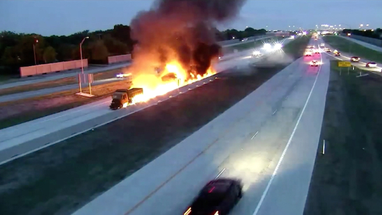 Ένας οδηγός φορτηγού καταλήγει σε μια δύσκολη κατάσταση μετά από μια συντριβή με τα διαχωριστικά εμπόδια σε εθνική όταν το φορτηγό του άρπαξε φωτιά στην αμερικανική πόλη Grand Prairie.