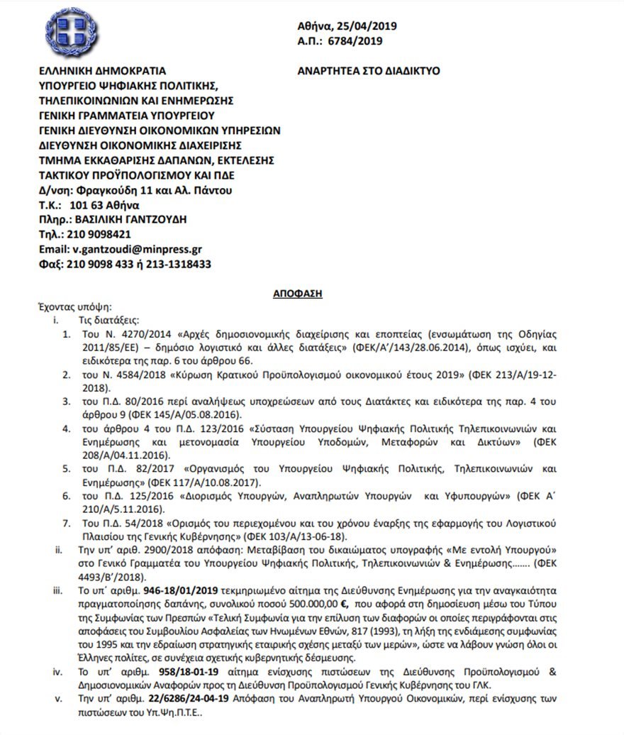 Ειδικότερα με απόφαση του γενικού γραμματέα Ψηφιακής Πολιτικής Γιώργου Φλωρεντή, ύστερα από υπουργική εντολή, της 25ης Απριλίου 2019, εγκρίνεται η δέσμευση πίστωσης ύψους 500.000 ευρώ για την πραγματοποίηση ισόποσης δαπάνης προβολής. Πρόκειται για την υλοποίηση “τεκμηριωμένου αιτήματος της Διεύθυνσης Ενημέρωσης για την αναγκαιότητα πραγματοποίησης δαπάνης, συνολικού ποσού 500.000ευρώ,