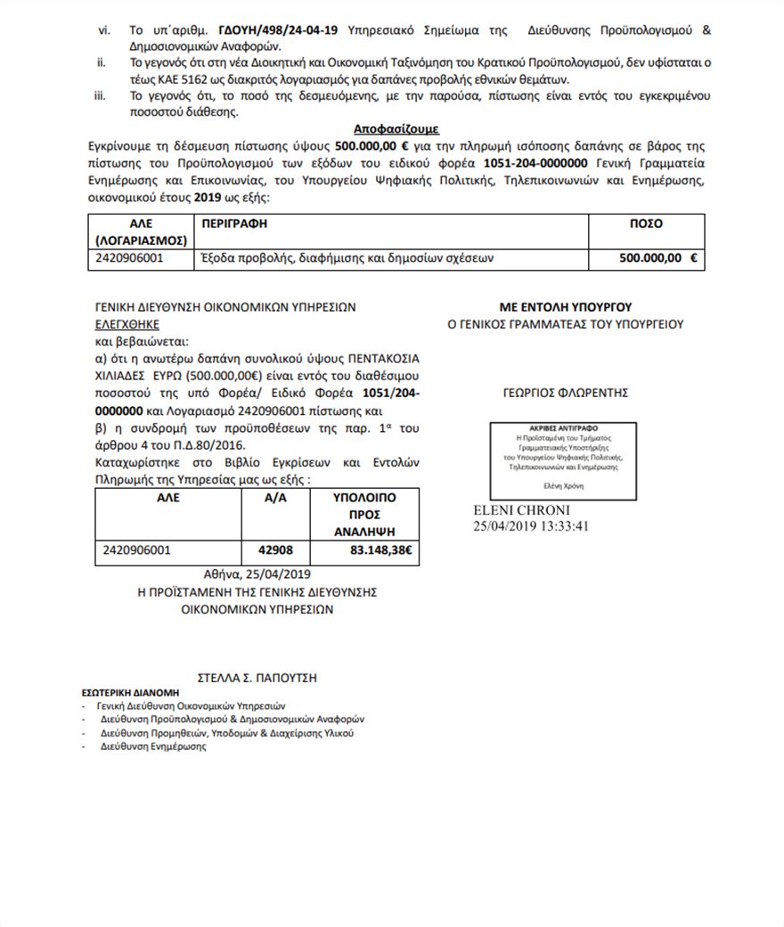 Ειδικότερα με απόφαση του γενικού γραμματέα Ψηφιακής Πολιτικής Γιώργου Φλωρεντή, ύστερα από υπουργική εντολή, της 25ης Απριλίου 2019, εγκρίνεται η δέσμευση πίστωσης ύψους 500.000 ευρώ για την πραγματοποίηση ισόποσης δαπάνης προβολής. Πρόκειται για την υλοποίηση “τεκμηριωμένου αιτήματος της Διεύθυνσης Ενημέρωσης για την αναγκαιότητα πραγματοποίησης δαπάνης, συνολικού ποσού 500.000ευρώ,