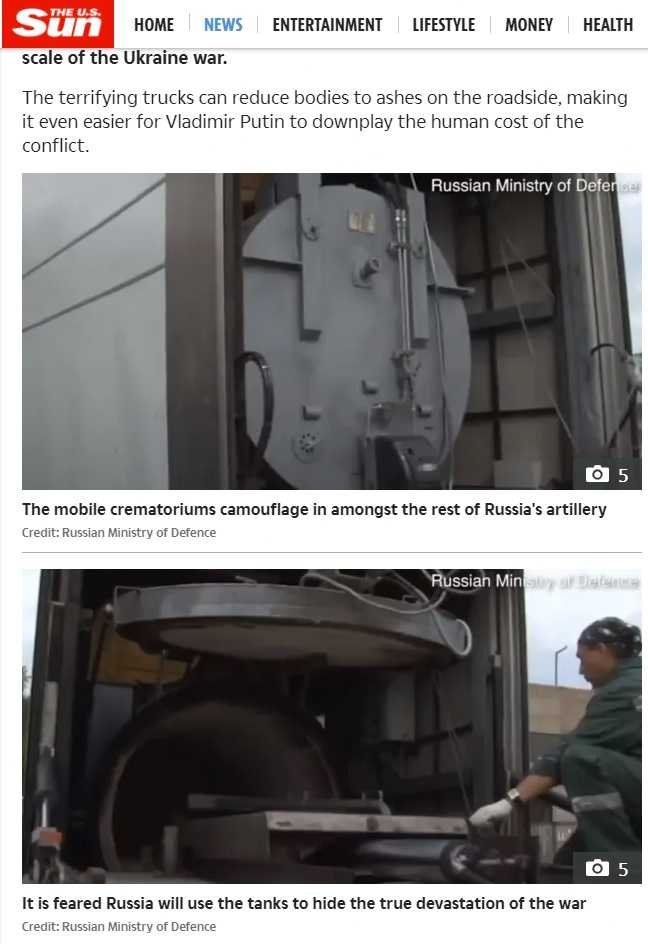 Όλα τα ελεγχόμενα μέσα ενημέρωσης κυκλοφόρησαν αυτή την εβδομάδα με ένα προπαγανδιστικό κομμάτι από την The Telegraph που ισχυριζόταν ότι η Ρωσία είχε αναπτύξει «κινητά κρεματόρια» για να «κρύψει στοιχεία απωλειών στο πεδίο της μάχης», γράφει το Informationliberation.com.