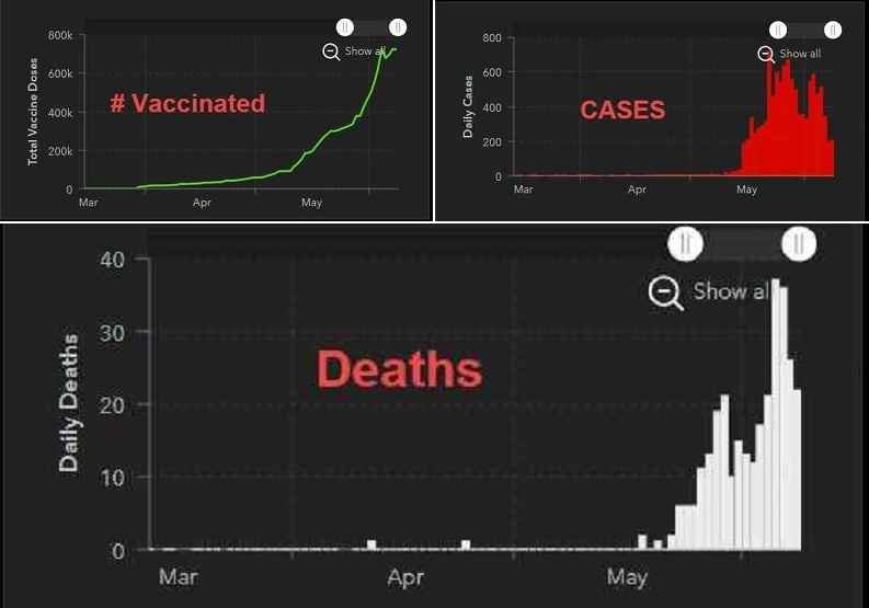 Αν κοιτάξουμε τους αριθμούς ΝΕΚΡΩΝ είναι πραγματικά συγκλονιστικοί. Η παρακάτω εικόνα δείχνει τον αριθμό των μολυσμένων, τον αριθμό των θανάτων και τον αριθμό των εμβολιασμών, με αυτή τη σειρά, από τον Μάρτιο του 2021 έως την προηγούμενη χθες, 9 Ιουνίου 2021.