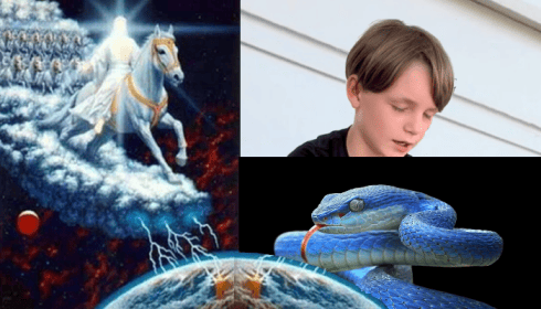 – Και μετά ο Άλεξ κι εγώ γυρίσαμε ξανά και είδαμε τον Ιησού. Αλλά είχε αλλάξει. Τα μάτια του ήταν κατακόκκινα, καθόταν σε ένα τεράστιο άλογο και κρατούσε μια τεράστια κόρνα στα χέρια του. Η κόρνα ήταν πολύ μεγάλη – περίπου στο μέγεθος ενός γηπέδου μπάσκετ. Και όταν τη σάλπισε, ξαφνικά βρεθήκαμε όλοι πάνω σε άλογα και ορμήσαμε κάτω με τον Ιησού. Και είδα ένα πολύ μεγάλο φίδι εκεί. Το φίδι ήταν πολύ, πολύ μεγάλο. Το κεφάλι του δεν ήταν καν τόσο μεγάλο όσο ένα κτίριο, αλλά τόσο μεγάλο όσο όλα τα κτίρια στην περιοχή μας μαζί. Ο Ιησούς σκότωσε αυτό το φίδι και αυτό ήταν το τέλος.