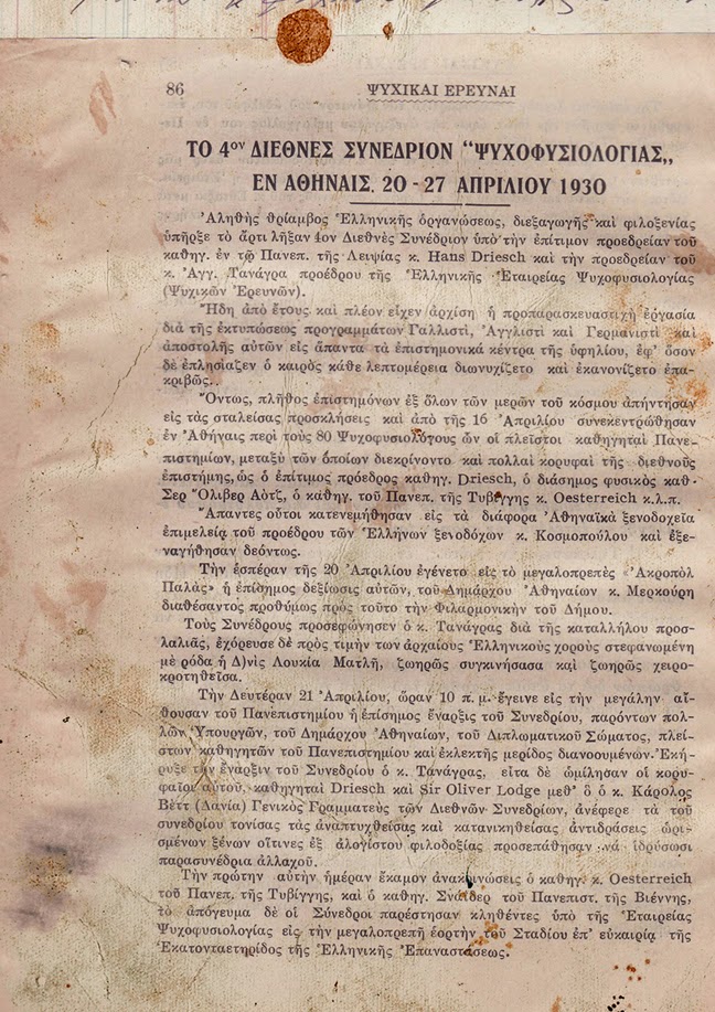 «Έχω την ευχαρίστηση να σας ανακοινώσω ότι στις 5 Δεκεμβρίου γιορτάσαμε τα 10 χρόνια από την ίδρυση της εταιρείας μας, το 1923. Μετά από εμένα, πολλοί καθηγητές πήραν τον λόγο ανάμεσα σ’ αυτούς και ο Δρ. Λιβιεράτος (καθηγητής Παθολογίας), ο Δρ. Μέρμηγκας (καθηγητής Χειρουργικής), καθώς επίσης και ο πρόεδρος της Ένωσης Ιατρών Αθηνών, Δρ. Βλαβιανός. Παραβρέθηκαν πολλοί καθηγητές, βουλευτές, άνθρωποι των γραμμάτων και μεγάλο πλήθος. Όλος ο τύπος ήταν πολύ ευνοϊκός απέναντι μας. Όλοι ανακοίνωσαν ότι η εταιρεία μας επέβαλε την ψυχική έρευνα στην Ελλάδα. […]