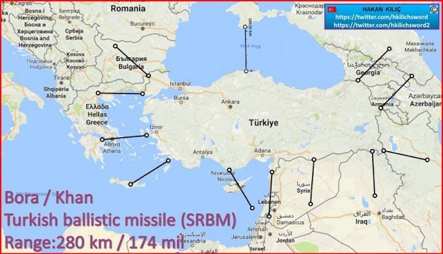 Τα τουρκικά μέσα μάλιστα παρουσιάζουν χάρτες με την απόσταση από τη Θεσσαλονίκη και από άλλες περιοχές της Ελλάδας για να αποδείξουν ότι μια επιχείρηση κατά της χώρας μας θα έχει σίγουρο αποτέλεσμα χάρη στον τακτικό βαλλιστικό πύραυλο Bora που ανέπτυξε η τουρκική εταιρεία ROKETSAN και εντάχθηκε στην δύναμη του τουρκικού Στρατού.