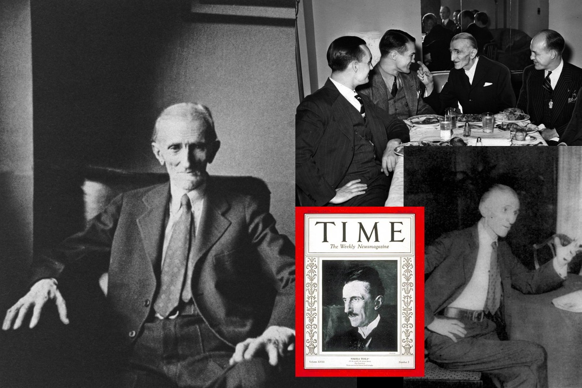 Ο Nikola Tesla στο δωμάτιο του ξενοδοχείου του στα τέλη της δεκαετίας του 1930, μετά το τροχαίο ατυχημά του. Δεξιά, πιθανόν η τελευταία φωτογραφία του πριν την δολοφονία του 7 Ιανουαρίου 1943. Τον βρήκαν νεκρό δυο μέρες μετά γιατί είχε κρεμάσει, όπως έκανε πάντα, στην πόρτα του δωματίου του την επιγραφή «ΜΗΝ ΕΝΟΧΛΕΙΤΕ, ΕΡΓΑΖΟΜΑΙ».