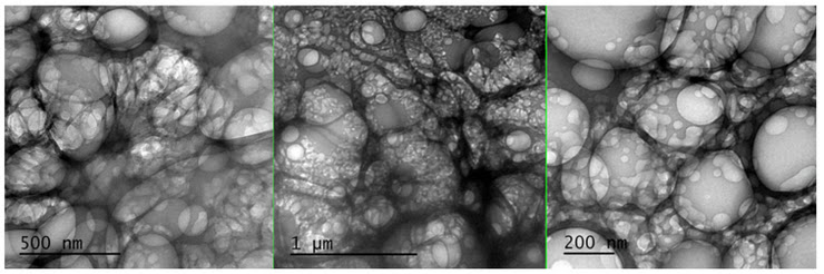 Χρησιμοποιώντας ηλεκτρονικό μικροσκόπιο (TEM), παρατηρήσαμε μια περίπλοκη συστοιχία ή πλέγμα διπλωμένων ημιδιαφανών εύκαμπτων φύλλων rGO με ένα μείγμα πιο σκούρων πολυστρωματικών συσσωματώσεων και ανοιχτόχρωμων απλωμένων μονοστιβάδων όπως φαίνεται στο σχήμα 4.