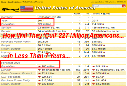 Όπως έχουμε αναφερθεί στο παρελθόν πολλές φορές στο ANP, με τον ιστοχώρο που συνδέεται βαθιά με το κράτος,το Deagel.com εξακολουθεί να προβλέπει μια τεράστια εκδήλωση αποδημίας ή γεγονότα για τις Ηνωμένες Πολιτείες τα επόμενα 6+ χρόνια, οδηγώντας τους να προβλέψουν ότι θα ζουν μόνο τα 100 εκατομμύρια άνθρωποι εδώ το 2025 (από 327 εκατομμύρια το 2017!), Δεν θα θέλαμε τίποτα πέρα από εκείνους που έχουν εδώ και καιρό «κυβερνήσει τον κόσμο» και ζήτησαν μαζική αποδυνάμωση του πλανήτη μας, με τις «κατευθυντήριες γραμμές» τους, γραμμένες σε γρανίτη και στα Γεωργιακά Guidestones.