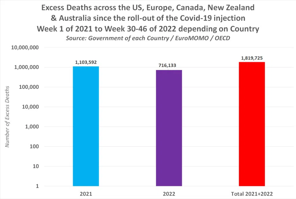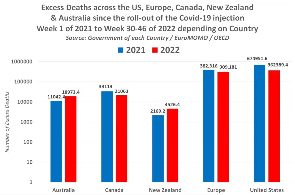 Συνολικά, το «Five Eyes» και το μεγαλύτερο μέρος της Ευρώπης είχαν 1.103.592 υπερβολικούς θανάτους το 2021 και 716.133 υπερβολικούς θανάτους μέχρι τον Νοέμβριο του 2022.