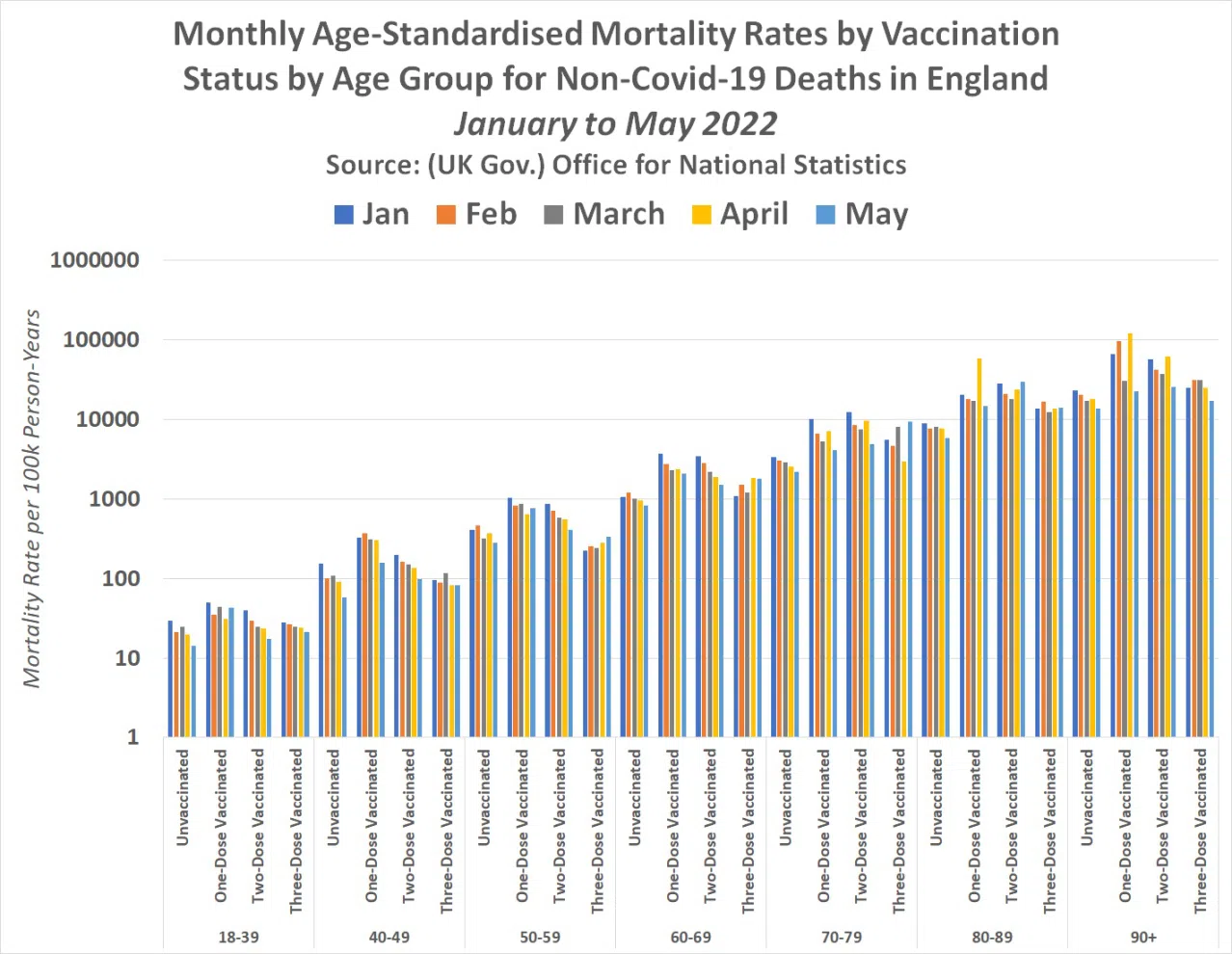 Από τον Μάιο του 2022, τον πιο πρόσφατο μήνα με διαθέσιμα δεδομένα, οι μερικώς εμβολιασμένοι, διπλοεμβολιασμένοι και τριπλά εμβολιασμένοι πληθυσμοί στην Αγγλία είχαν περισσότερες πιθανότητες να πεθάνουν από οποιαδήποτε αιτία σε σχέση με τον μη εμβολιασμένο πληθυσμό σε όλες τις ηλικιακές ομάδες.
