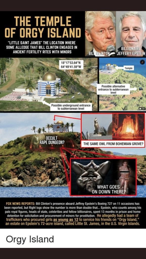 Εκτός από το κύκλωμα παιδοφιλίας που είχε στήσει ο παιδόφιλος Επστειν στην βίλα του για όλους τους σατανολάτρες ηγέτες των Ελεύθερων Πολιτειών και μυστικών λεσχών, δεν διστάζει να προβάλει τον θεό του, για τον οποίο γίνονται όλες αυτές οι πράξεις βιασμών και φυλάκισης μικρών κοριτσιών στον ναό και νησί των οργίων που βλέπετε στην φωτογραφία.
