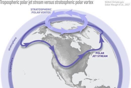 «Τα ατμοσφαιρικά πλανητικά κύματα πέφτουν στην πολική στρατόσφαιρα, αυξάνοντας τη θερμοκρασία της», λέει ο Μπάτλερ. «Αυτό το ονομάζουμε γεγονός «ξαφνικής υπερθέρμανσης της στρατόσφαιρας» και μπορεί να προκαλέσει την αλλαγή κατεύθυνσης της δίνης».