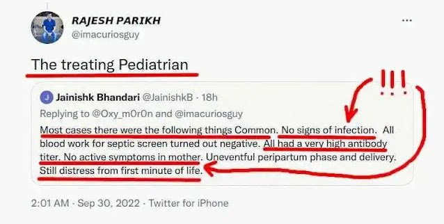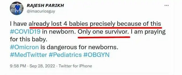 Ένα τραγικό μήνυμα στο Twitter (σύνδεσμος αρχείου, ThreadReader) από έναν Ινδό γυναικολόγο Dr. Rajesh Parikh. Δρ. Ο Parikh υπογραμμίζει τους κινδύνους του Covid δείχνοντάς μας ένα νεογέννητο, που πάσχει από αναπνευστική δυσχέρεια και οι «Λευκοί πνεύμονες», που δεν μπορούσαν να αναπνεύσουν, έσπευσαν στη ΜΕΘ λόγω του MIS-N, «Νεογνά με Φλεγμονώδες Σύνδρομο Πολυσυστήματος», γράφει ο Igor Chudov.